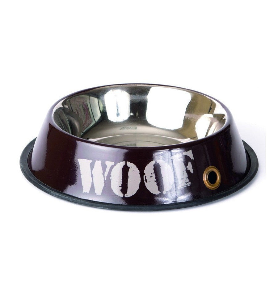 Este comedero "Woof "marrón es de acero inoxidable de alta calidad, muy resistente, fácil de limpiar y no es tóxico. Puede ser utilizado tanto para la comida como para el agua. Disponible en tres tamaños, solo hay que elegir el que mejor se adapte a su perro. ^^