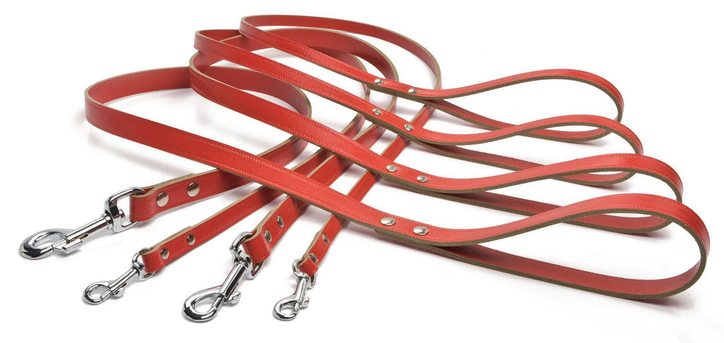 Fantástica correa de piel reforzada en el extremo superior para mayor comodidad en la sujección del animla. En el extremo inferior enganche para metálico para sujetar al perro. En color rojo, longitud 100 cm, el ancho varía.