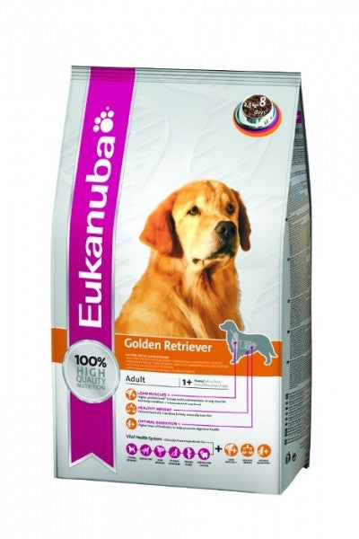 Golden Retrievers son perros amistosos e inteligentes, bien educados, con mucho encanto. Necesitan nutrientes esenciales para conseguir un pelo esplendido y el consumo de fibras prebioticas puede mejorar el proceso de la digestion.El ejercicio habitual es magnifico para mantener una condicion fisica optima. Eukanuba Golden Retriever constituye una alimentacion diaria completa y equilibrada, disenada para mantener un pelo brillante, fomentar la salud de las articulaciones y favorecer el proceso de la digestion. Eukanuba Golden Retriever esta hecho con: 1. Elevada proporcion de proteinas y acidos grasos omega-3 y omega-6 para el cuidado de la piel y el pelo 2. Nutrientes para los cartilagos + L-carnitina para mejorar la salud de las articulaciones y lograr un peso optimo 3. Una mezcla especial de fibras y prebioticos favorece una digestion sana, asi como la correcta absorcion de los nutrientes 4. Vitamina E que fortalece el sistema inmunológico.