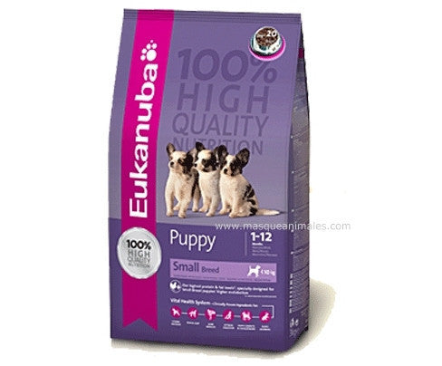 Los cachorros de razas pequenas queman mas calorias y necesitan mas energiapor Kg de peso corporal que los de razas mas grandes. Eukanuba Puppy & Junior Razas Pequenas aporta los niveles adecuados de proteina, grasa e hidratos decarbono para cubrir esa necesidad. Proporciona todas las vitaminas y minerales necesarios para el crecimiento. Contiene ingredientes de alta calidad y altos nivelesde proteina de origen animal, siendo el pollo la fuente principal de proteina. No contiene colorantes ni conservantes anadidos.
