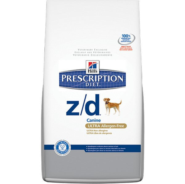 Para el tratamiento nutricional de animales de compañía con alergia e intolerancia alimentaria. La alergia e intolerancia alimentaria puede ser suave o grave y puede conllevar dolorosos problemas de piel, oídos y tracto digestivo. Estos problemas, también conocidos como reacciones adversas al alimento, son por lo general una respuesta a las proteínas del alimento. Hill s Prescription Diet Canine z/d ULTRA Allergen Free ha sido formulado por veterinarios para casos extremos de alergia e intolerancia alimentaria. Ha sido exclusivamente formulado con Hill s Hydrolyzed Protein System, una proteína exclusiva que ayuda a eliminar la posibilidad de reacciones adversas al alimento. La mayoría de las reacciones se producen debido a alergia a la ternera, los productos lácteos o el trigo. Canine z/d ULTRA Allergen Free no contiene ninguno de ellos. Este producto es considerado "Gold Standard" por los veterinarios de Hill s, puesto que proporciona el alimento más novedoso a la hora de eliminar la posibilidad de reacciones adversas o alergia alimentaria en perros. El precio merece la confianza que le dará proporcionar alivio a su perro.^^Este pienso no está indicado para:^- Gatos^- Cachorros^- Hembras en gestacion o lactacion