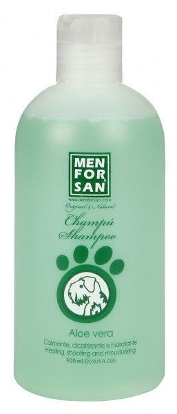 Champú de máxima calidad con extracto de ALOE VERA para perros que activa y vivifica las células de la piel, ejerciendo una profunda acción calmante, cicatrizante e hidratante. El aloe vera posee funciones antisépticas y cicatrizantes naturales. Recomendable en pieles con irritaciones, picaduras de insectos, heridas superficiales, erupciones y eccemas. Hidrata en profundidad y es muy útil en pelajes sensibles y estropeados. Se puede utilizar como fortalecedor del cabello por sus agentes nutritivos, ya que proporciona suavidad, resistencia y flexibilidad. Apto para todo tipo de razas de perros y para uso frecuente. Ph balanceado.