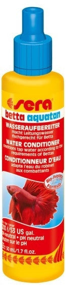 Sera Betta Aquatan, con la fórmula sera Bio-Protect, acondiciona el agua del grifo de forma inmediata, de acuerdo con las necesidades de los peces luchadores de Siam y de otros anabántidos. 50 ml para 200 litros de agua.