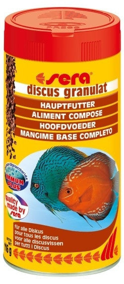El granulado básico para todos los discus. Sera Discus Granulat es un alimento granulado que se hunde lentamente, para discus y otros peces ornamentales exigentes. El granulado, que es blando en el agua, no hincha y, por eso, no afecta a los peces. El tamaño, el color y la composición están perfectamente adaptados a las necesidades especiales des los discus y permiten una alimentación adecuada y equilibrada. Variedades: 100 ml (48 g), 250 ml (116 g), 500 ml (205 gr), 1000 ml (480 gr), 4,2 kg.. Ingredientes: harina de pescado, harina de trigo, germen de trigo, levadura de cerveza, Ca-caseinato, espirulina, gluten de trigo, aceite de pescado, harina de krill, harina de Gammarus, mejillón de labio verde (Perna canaliculus) en polvo, ortiga, hierbas, alfalfa, ajo, algas marinas, pimentón, espinaca, perejil, zanahorias. Contiene colorantes permitidos por las normas de la Unión Europea.