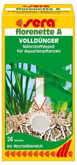 El abono completo en pastillas suministra todos los minerales y oligoelementos importantes a las plantas acuáticas que absorben los nutrientes a través de las raíces, para un crecimiento sano y colores exuberantes. Estabilizadores especiales garantizan que los nutrientes, principalmente el hierro, están disponibles para las plantas durante un largo período de tiempo. sera florenette A no contiene nitrato ni fosfato. El sera florena y el sera florenette A son una combinación perfecta para trabajar conjuntamente y corresponden a todas las necesidades de las diferentes especies de plantas acuáticas. Los números de las variantes indican la cantidad de pastillas.