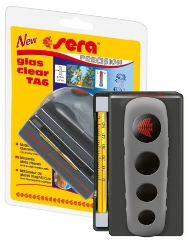 Los propietarios de acuarios lo saben: incluso el cuidado más meticuloso no impide las pequeñas incrustaciones de algas en los cristales. Y aunque este verdín sea biológicamente inofensivo, nos priva del verdadero placer de observar este pequeño oasis casero. La solución: la limpieza regular de los cristales con el imán antialgas de gran calidad SERA glas clear T/TA. Su resistente cepillo de plástico limpia a fondo la parte interior de los cristales, mientras que la parte externa revestida de fieltro se guía desde el exterior a lo largo de los puntos sucios. De esta forma se garantiza una limpieza meticulosa al tiempo que se cuidan los cristales sin rayarlos. El SERA glas clear T/TA ofrece pura comodidad gracias a su nueva técnica de inmersión: En caso de que ambos imanes se suelten el uno del otro, la parte interior se sumerge en línea recta hasta el suelo y se queda ahí en posición vertical. De esta forma se puede recoger cómodamente el cepillo de limpieza con el imán exterior. Gracias a esta técnica ni la arena que haya quedado aprisionada puede arañar los cristales, ni se tiene que pescar la parte interior flotante de la pecera. Una ventaja adicional: los imanes antialgas SERA glas clear serie T tienen un termómetro digital integrado, el imán antialgas SERA glas clear TA6 está equipado con un termómetro analógico de precisión.