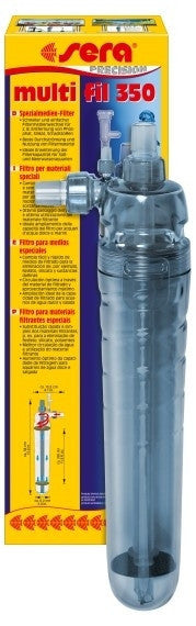 Sera Multi fil 350 es adecuado como filtro para el uso rapido de medios filtrantes especiales(sin red). Otra ventaja de este filtro consiste en que el agua circula de un modo óptimo por los materiales filtrantes introducidos. En muchos filtros exteriores esto no es así, ya que los medios filtrantes se introducen en una cesta de filtrado dentro de una redecilla, por lo que la velocidad del flujo y la circulacion del agua son demasiado. Con el Sera multi fil 350 se puede evitar el uso de cantidades innecesariamente grandes de costosos materiales de filtrado especiales, lo que es un alivio para el bolsillo y para el medio ambiente.