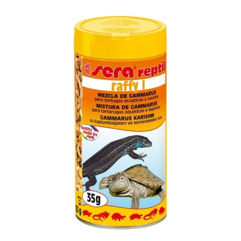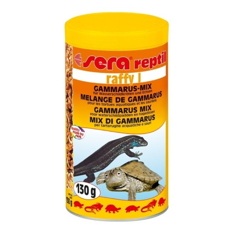 Se recomienda alimentar a sus reptiles con Sera Raffy I, alternado con Sera Raffy P, Sera Raffy mineral y Sera Raffy royal. Sera Raffy I contiene gammarus, anchoas y gambas.